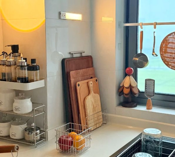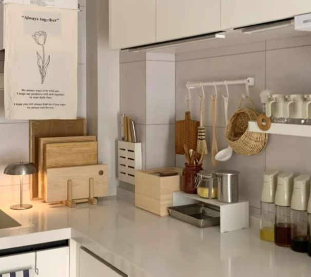 一个朴素的藤编篮子或一个原木色的分格托盘,就能成为收纳袋装香料、姜蒜的好去处。藤的纹理细腻交织,木的质感温厚沉稳,它们不仅中和了不锈钢电器的冷感,更能吸收空气中的嘈杂,让厨房一角显得安静而富有呼吸感。你可以将最常用的几瓶调料放在托盘里,其余的收进橱柜,台面便有了恰到好处的“留白”,这份留白就像句子间的逗号,让空间有了节奏与停顿。